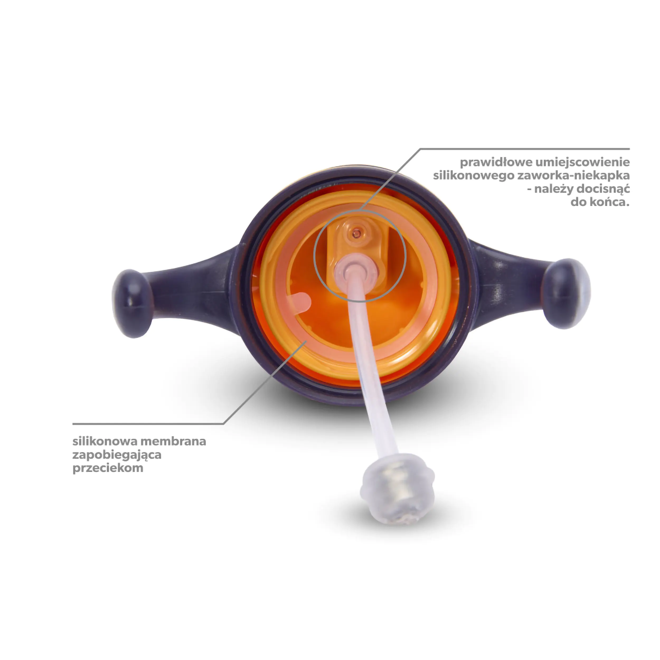Aktywacja zaworka: Przed pierwszym użyciem kilkakrotnie ściśnij silikonowy ustnik palcami, aby udrożnić dwukierunkowy zaworek.