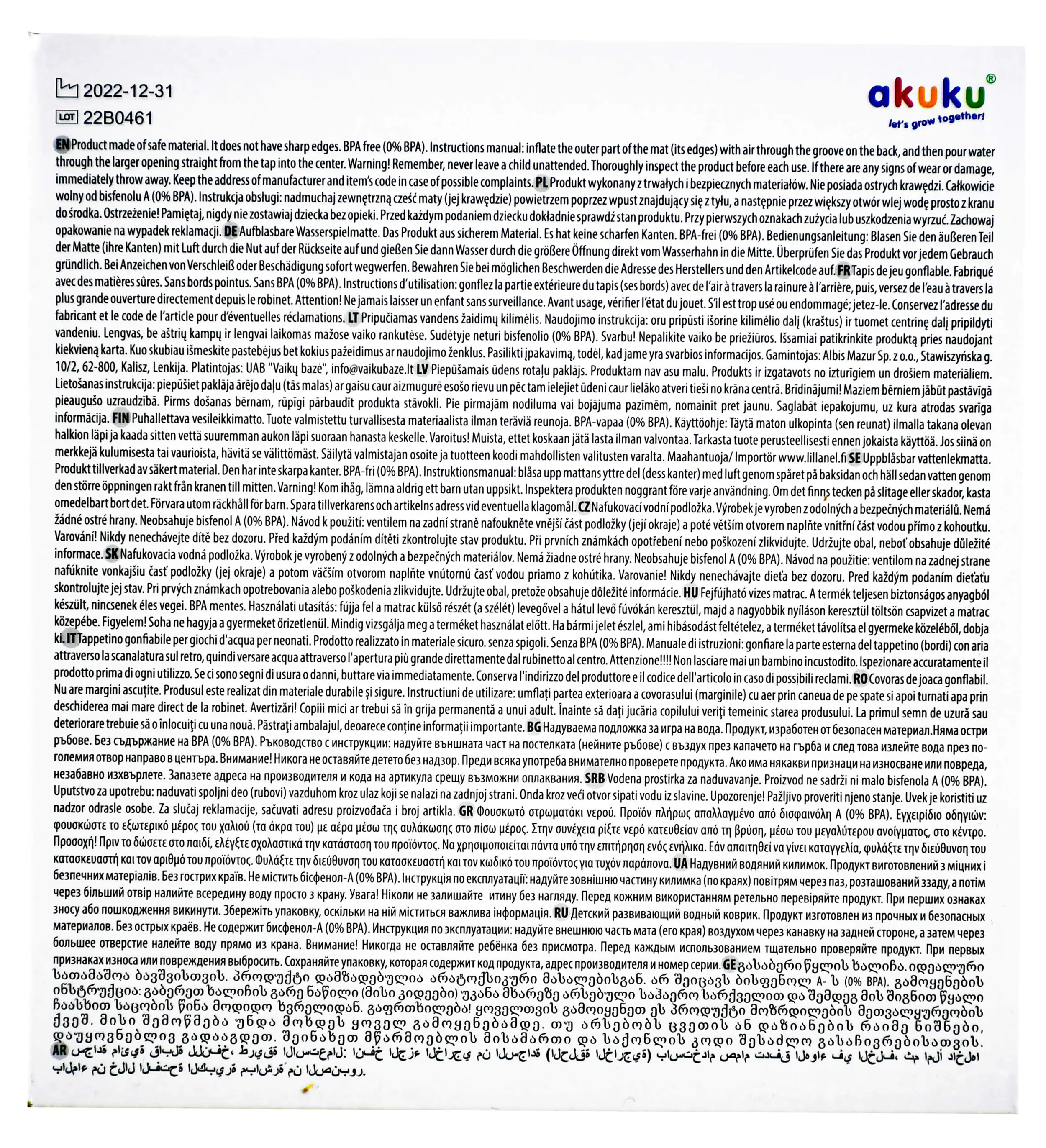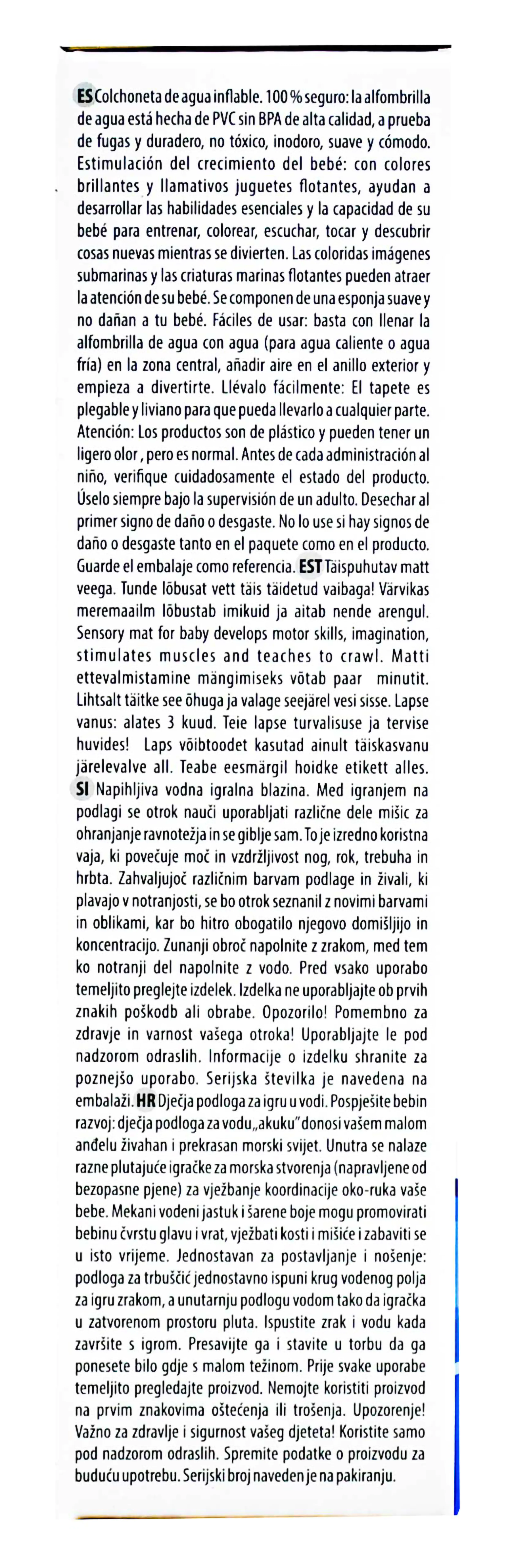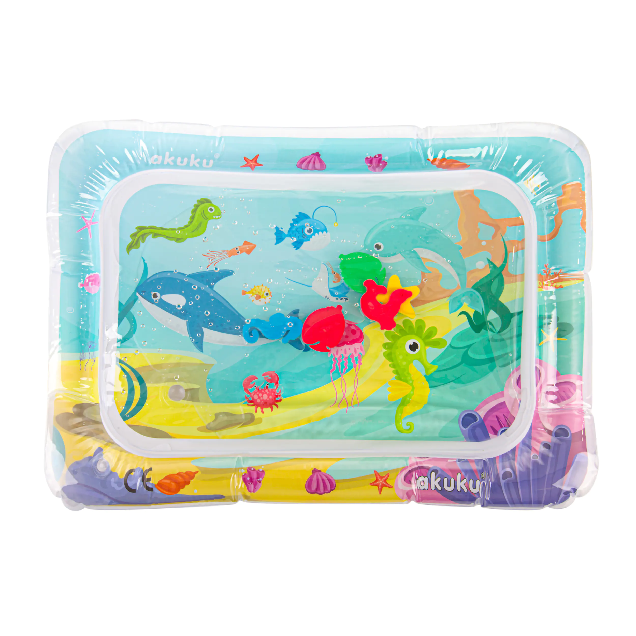 Mata wodna oferuje atrakcyjny motyw podwodnego świata oraz kontrastowe zwierzątka pływające wewnątrz, które pobudzają zmysły wzroku i dotyku, rozwijając wyobraźnię i koncentrację. Wykonana z bezpiecznego tworzywa, wolna od BPA, gwarantuje pełne bezpieczeństwo podczas zabawy, a jej miękka, pozbawiona ostrych krawędzi konstrukcja zapewnia komfort użytkowania.