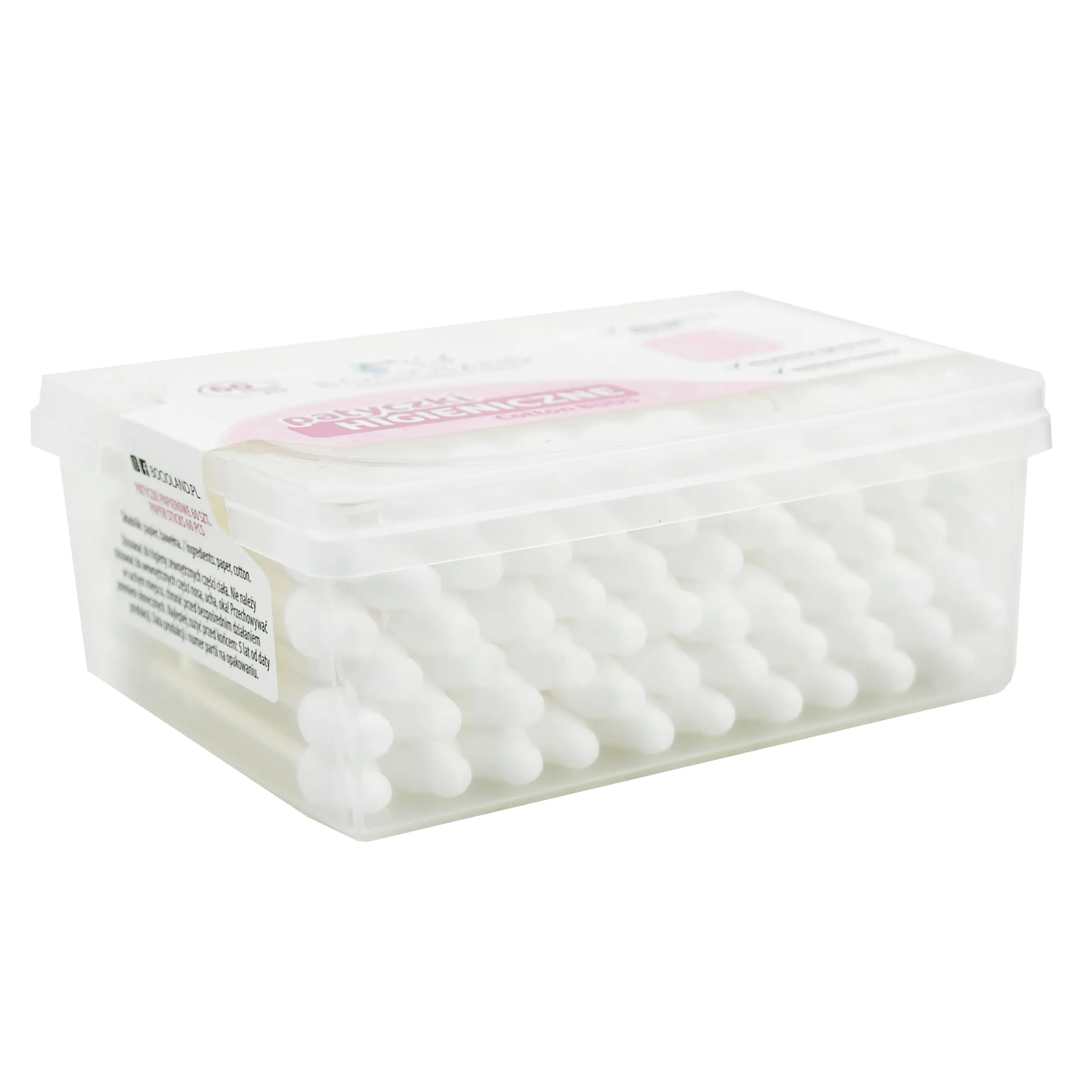 Bezpieczny Kształt (Ogranicznik): Unikalna, pogrubiona nasada bawełnianej główki uniemożliwia przypadkowe, zbyt głębokie wsunięcie patyczka do kanału słuchowego lub noska, co eliminuje ryzyko urazów.