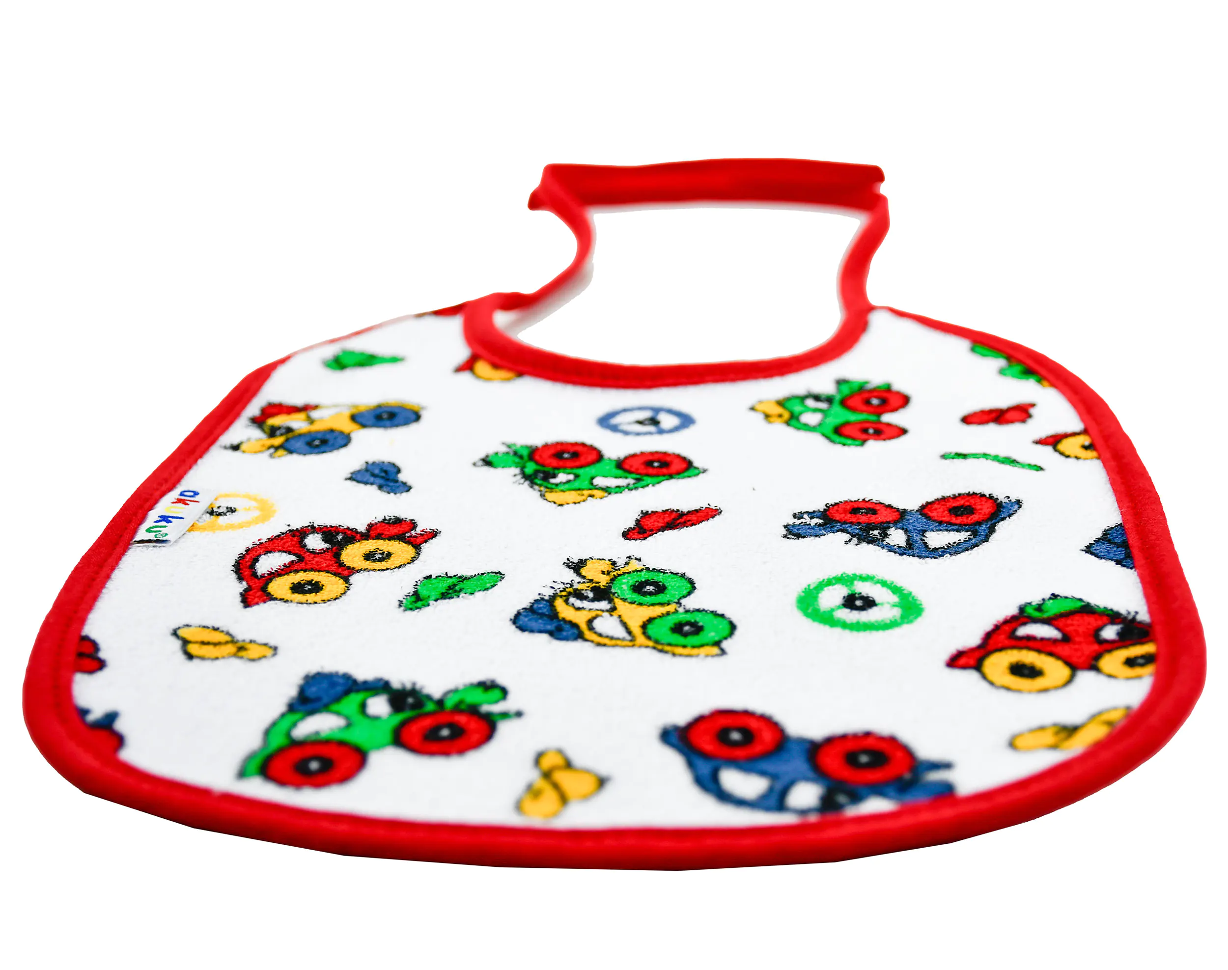 Wiązanie na troczki pozwala na stabilne dopasowanie do szyi dziecka, a kolorowe wzory sprawiają, że każdy posiłek staje się przyjemniejszy.
